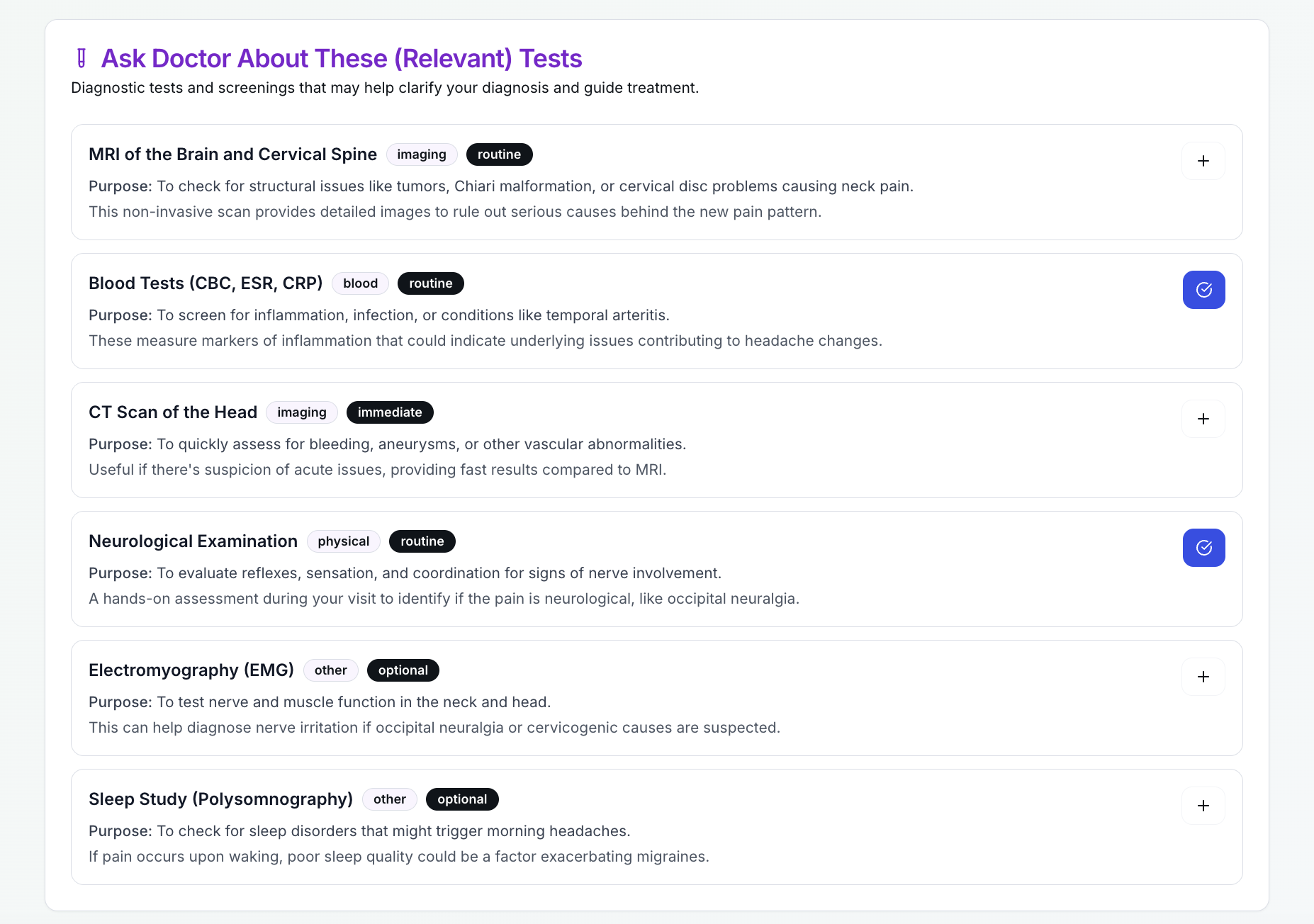 - Pinpointed questions: Generated from your symptoms and reports, so you know exactly what to ask.