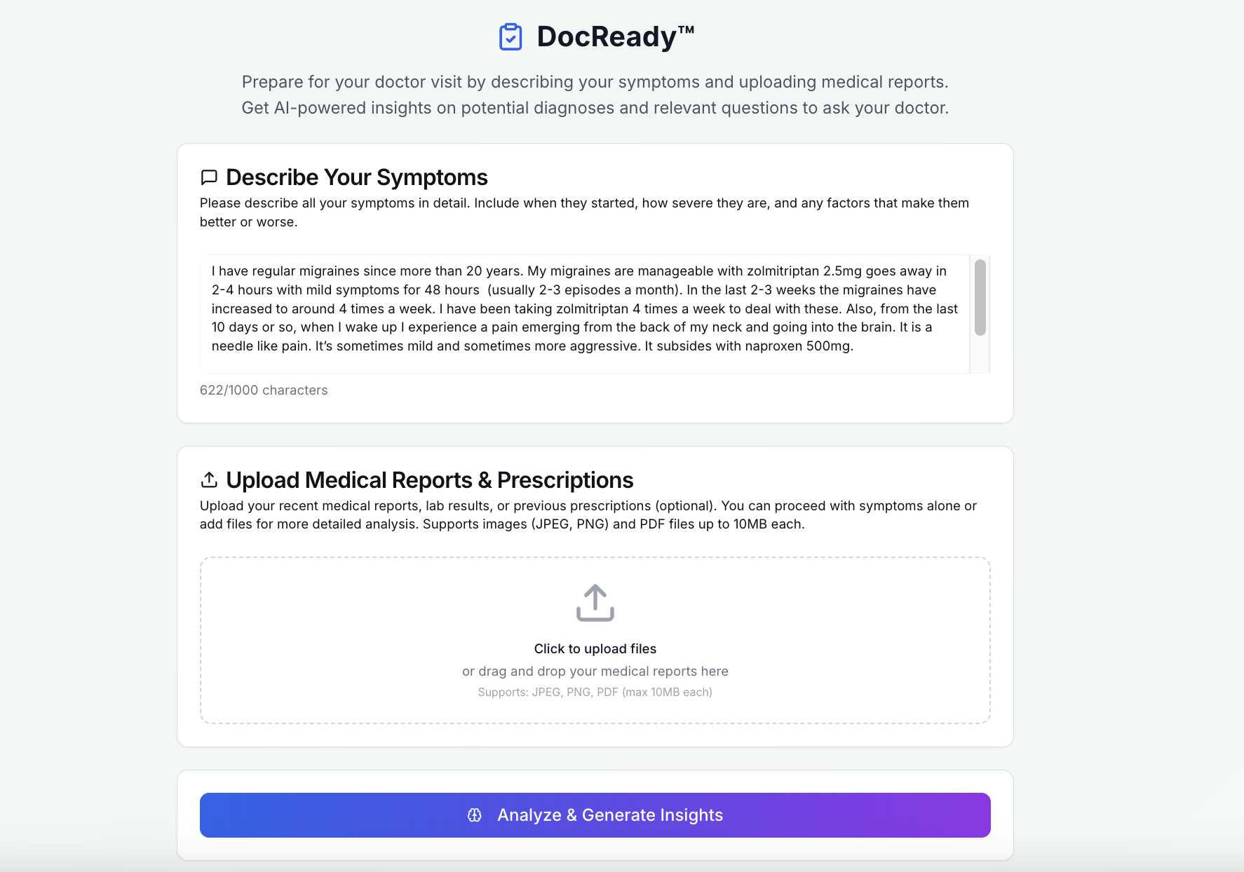 Most patients ask broad or generic questions (“Is this serious?”). DocReady helps you ask the right, targeted ones that make it hard for your doctor to miss a key detail — which can directly lead to a faster and more accurate diagnosis.